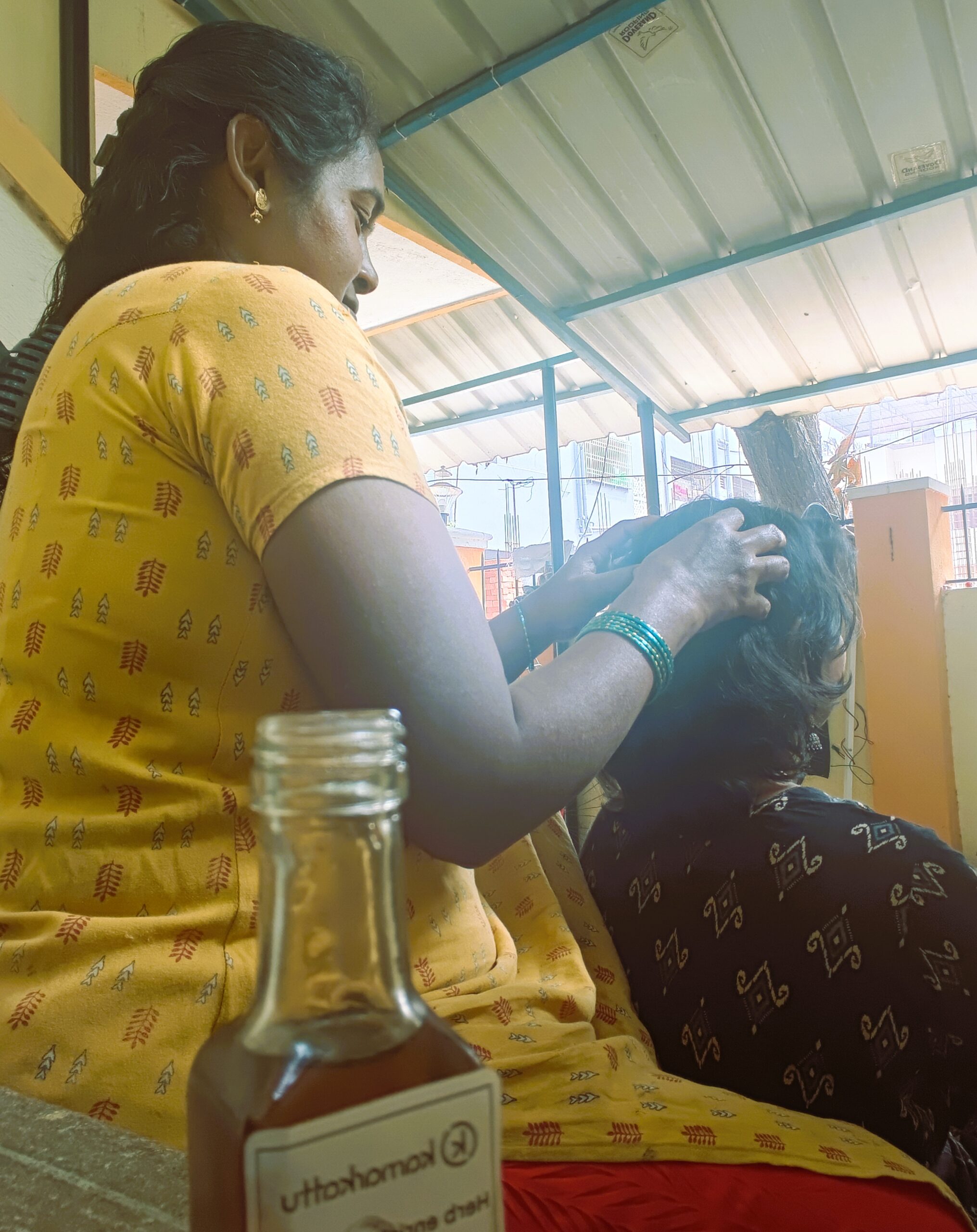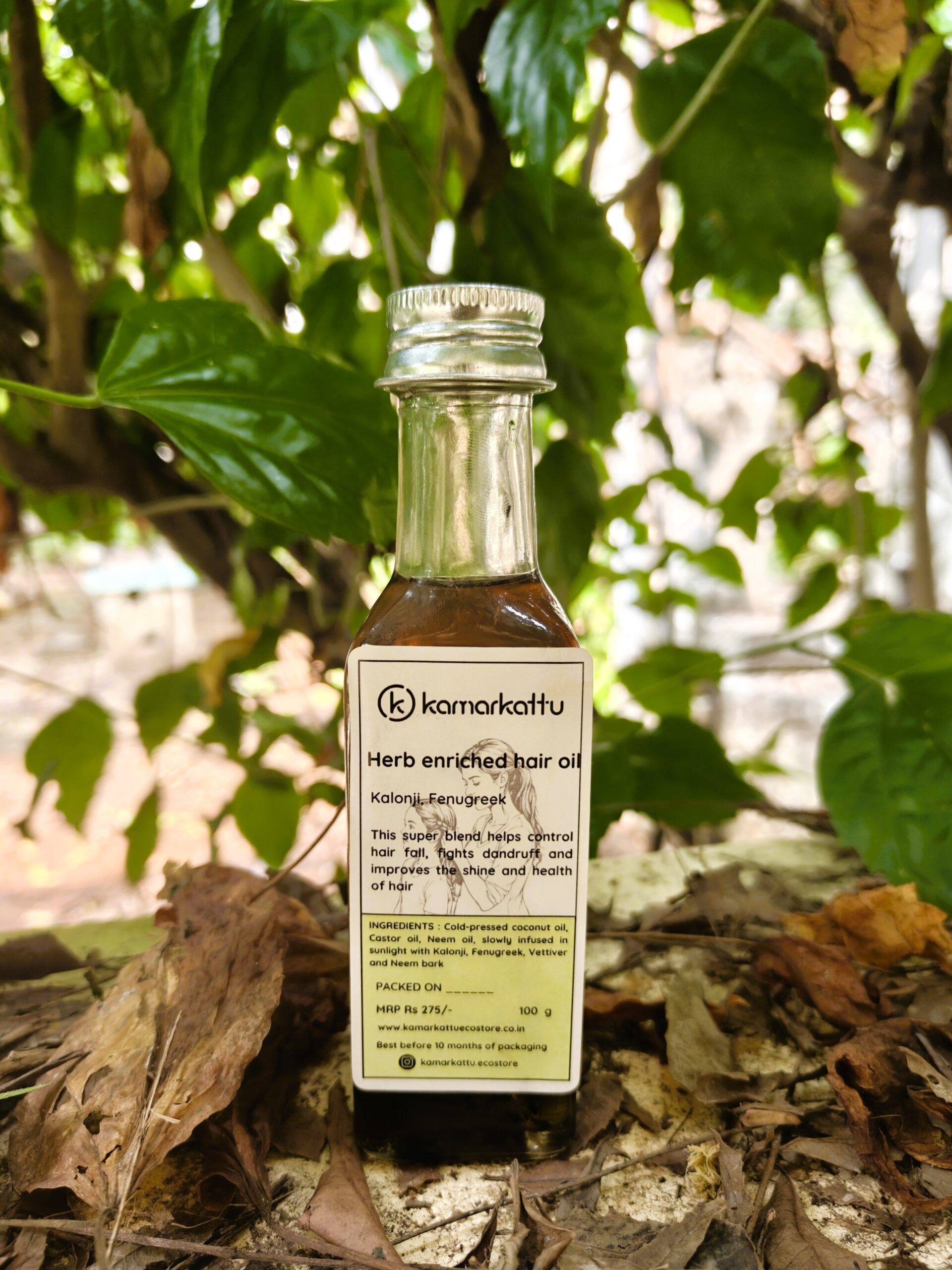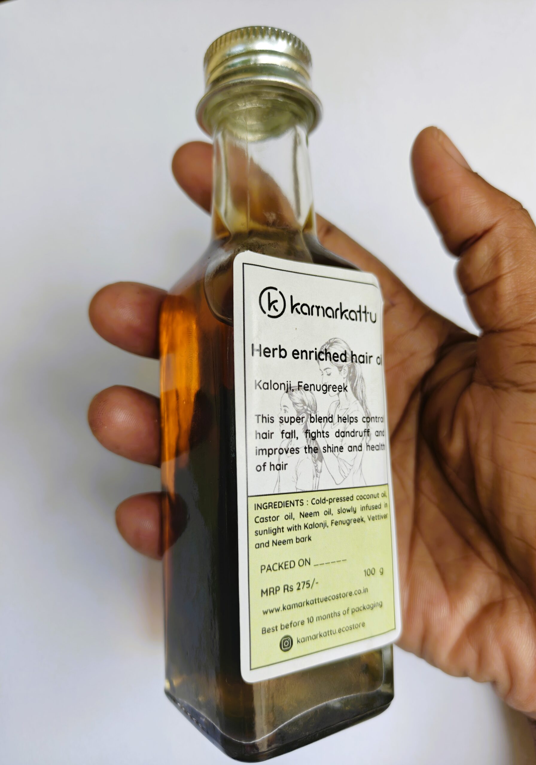 Cold-pressed coconut oil, Castor oil, Neem oil, slowly infused in sunlight with Kalonji, Fenugreek, Vettiver and Neem bark